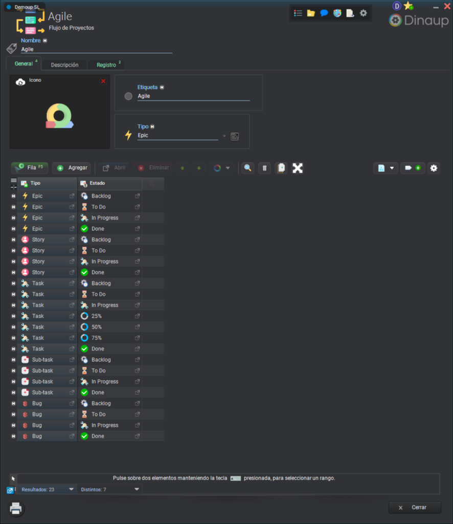 En Dinaup, los flujos se definen en la sección «Flujos de Proyectos». Aquí es donde puedes crear y personalizar los flujos que mejor se ajusten a las necesidades de tu equipo.